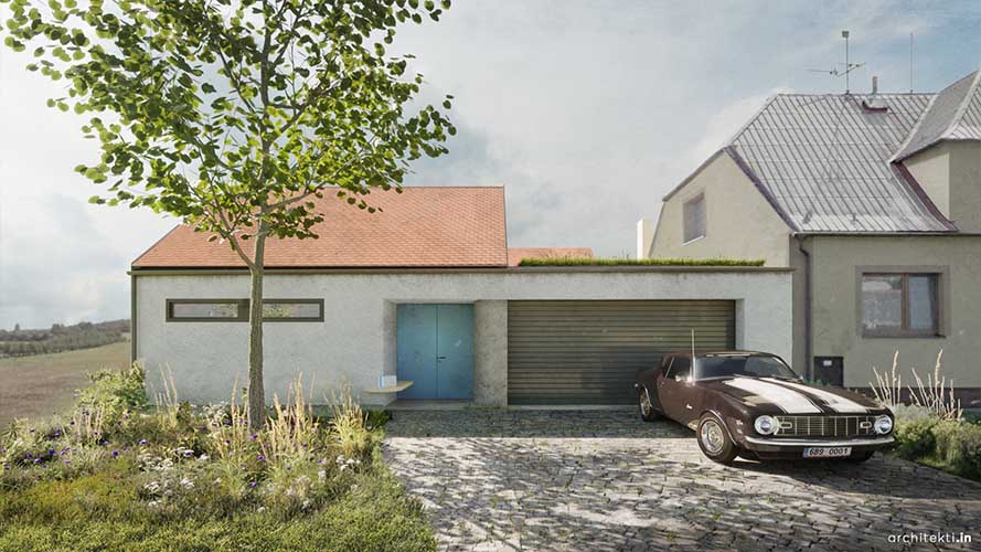 Tradiční venkovský dům s trochu netradičním uspořádáním. Dům poskytuje komfortní bydlení v přívětivé soukromé zahradě, ale také dostatečné prostory, pro hospodaření „kolem domu“. Prostor pro kutilství, všeliké skladování, ale třeba i pro společné moštování. Kdyby pršelo, z garáže může být i taneční parket - otevřený do dvorku, do ulice, anebo oboje.